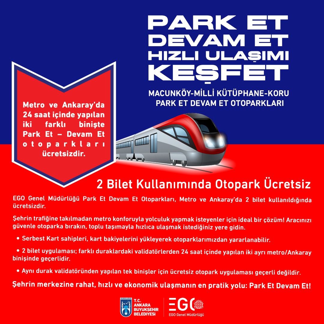 EGO Genel Müdürlüğü Park Et Devam Et Otoparkları, Metro ve Ankaray’da 2 Bilet Kullanıldığında Ücretsiz