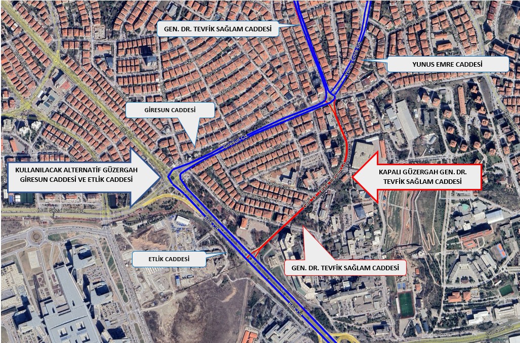 Keçiören İlçesi Gen. Dr. Tevfik Sağlam Caddesi üzerinde devam eden altyapı çalışması kapsamında Gen. Dr. Tevfik Sağlam Caddesi’nin Aşağı Eğlence Kavşak ile Etlik Caddesi arasında kalan kısmı araç geçişine kapatılmıştır.
