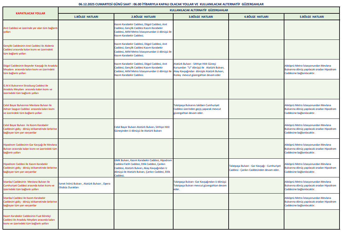 Atatürk Kültür Merkezi’nden başlayarak Kazım Karabekir Caddesi üzerinden Anadolu Meydanına kadar gerçekleşecek yürüyüş ve Anadolu Meydanında düzenlenecek etkinlik nedeniyle 06.12.2025 Cumartesi günü sabah saat 06.00’dan itibaren etkinliğin sona ereceği saate kadar kapalı olacak yollar ve bu yollardan geçen otobüs hatlarımızın kullanacağı alternatif güzergahlar tabloda belirtilmektedir.