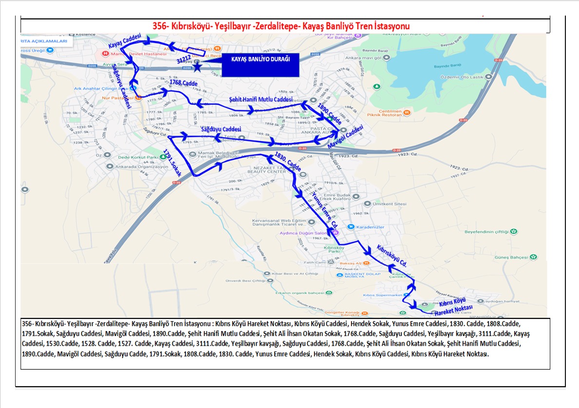 • 356 Kıbrısköyü – Yeşilbayır – Zerdalitepe – Kayaş Banliyö Tren İstasyonu