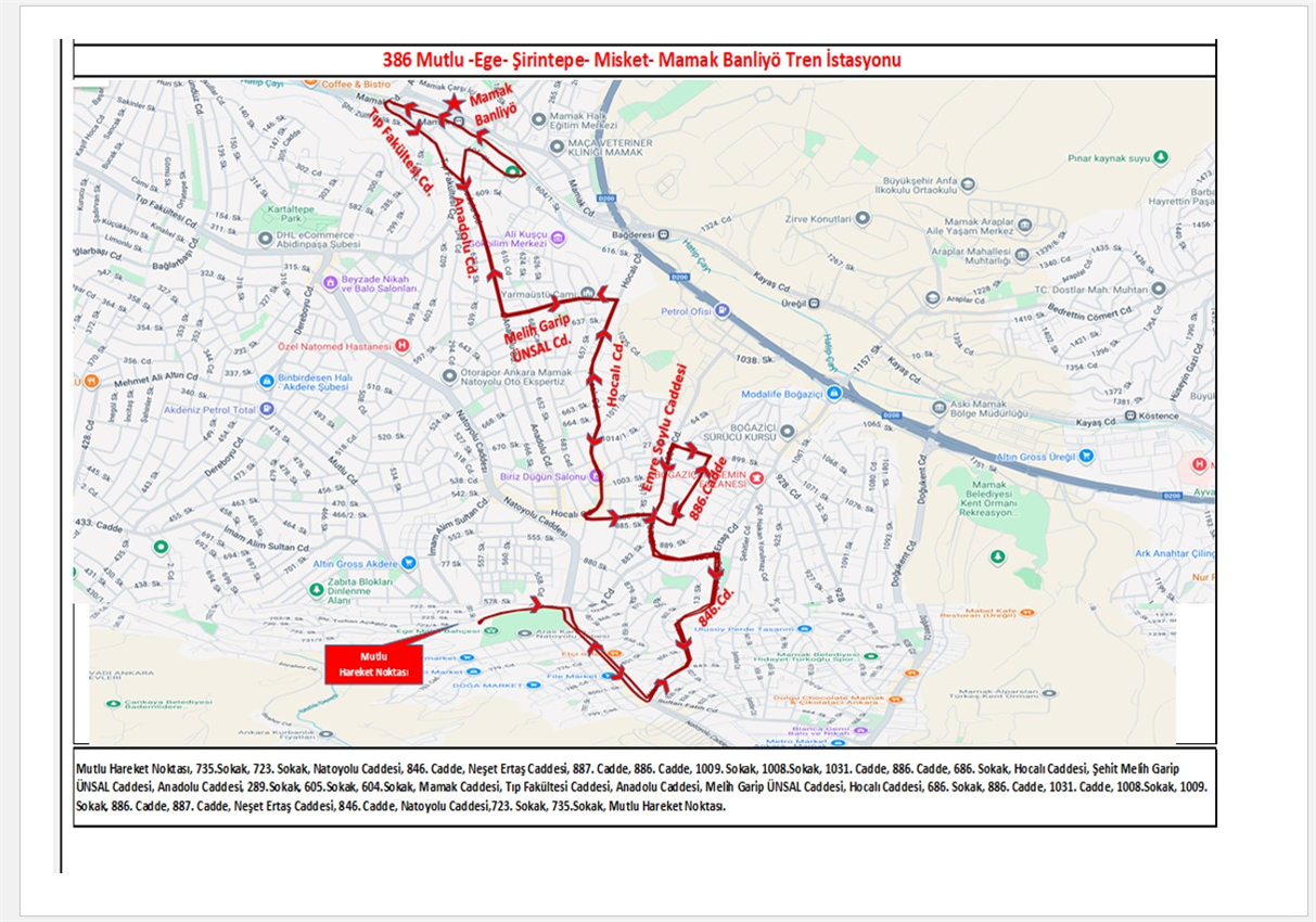 • 386 Mutlu – Ege – Şirintepe – Misket – Mamak Banliyö Tren İstasyonu