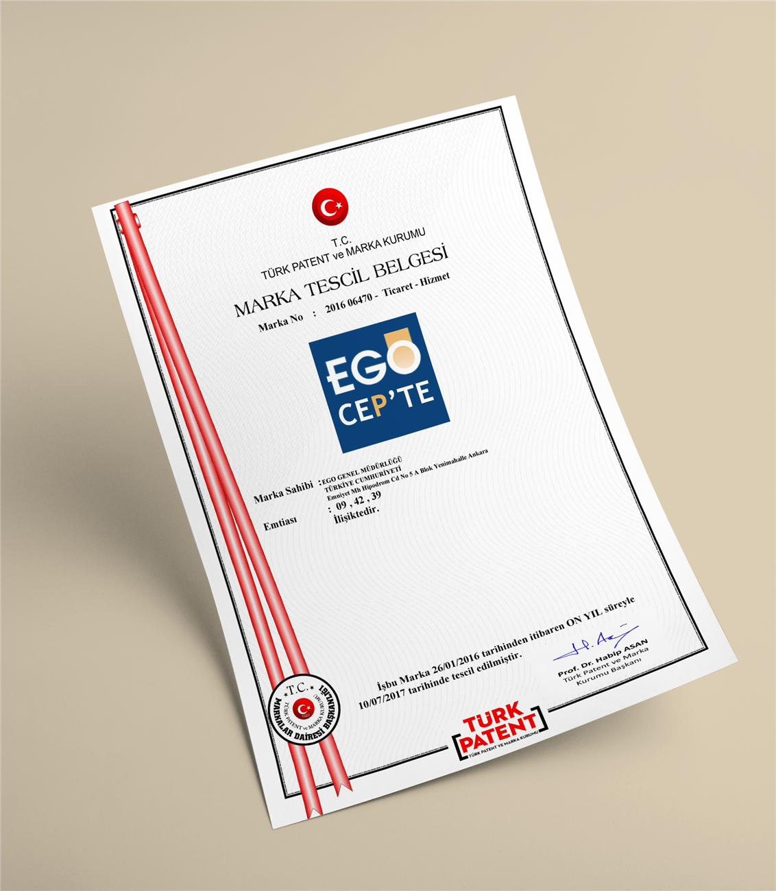 EGO Genel Müdürlüğü Bilgi İşlem Dairesi Başkanlığı’nca, geliştirilerek kullanıma sokulan EGO CEP’te uygulamasının marka adının tescillenmesi için bir yıl önceden Türk Patent ve Marka Kurumu’na başvurulmuş olup, EGO’nun başvurusunu değerlendiren Türk Patent ve Marka Kurumu, bir dünya markası haline gelen “EGO CEP’te” uygulamasını resmi olarak tescillemiştir.
