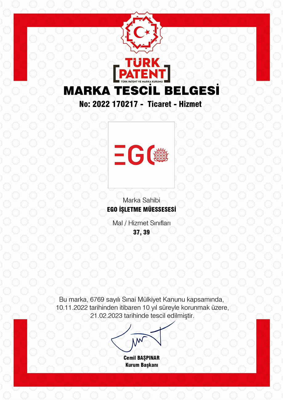 EGO GENEL MÜDÜRLÜĞÜ MARKA TESCİL BELGESİ